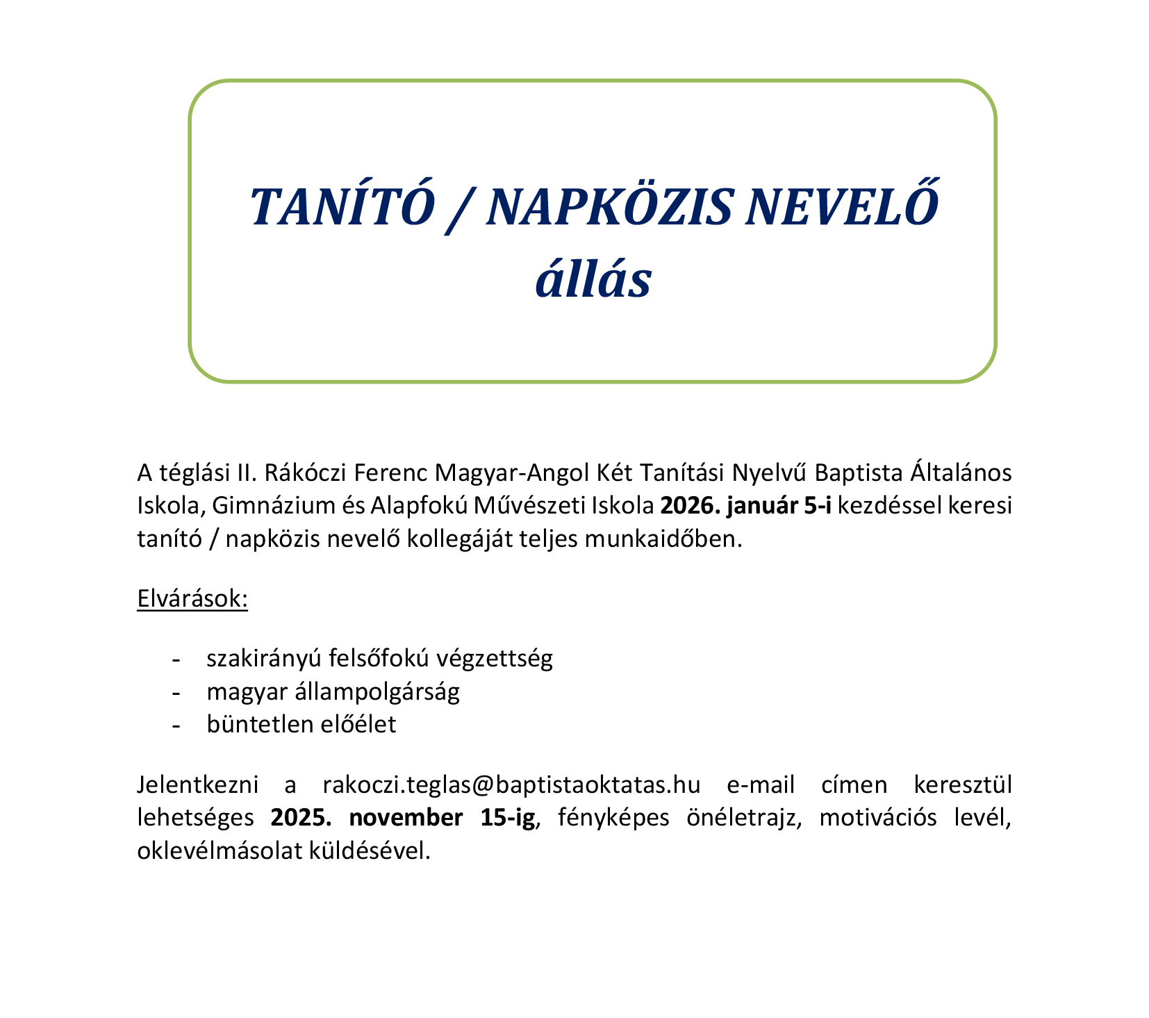 A téglási II. Rákóczi Ferenc Magyar-Angol Két Tanítási Nyelvű Baptista Általános Iskola, Gimnázium és Alapfokú Művészeti Iskola 2026. január 5-i kezdéssel keresi tanító / napközis nevelő kollegáját teljes munkaidőben.