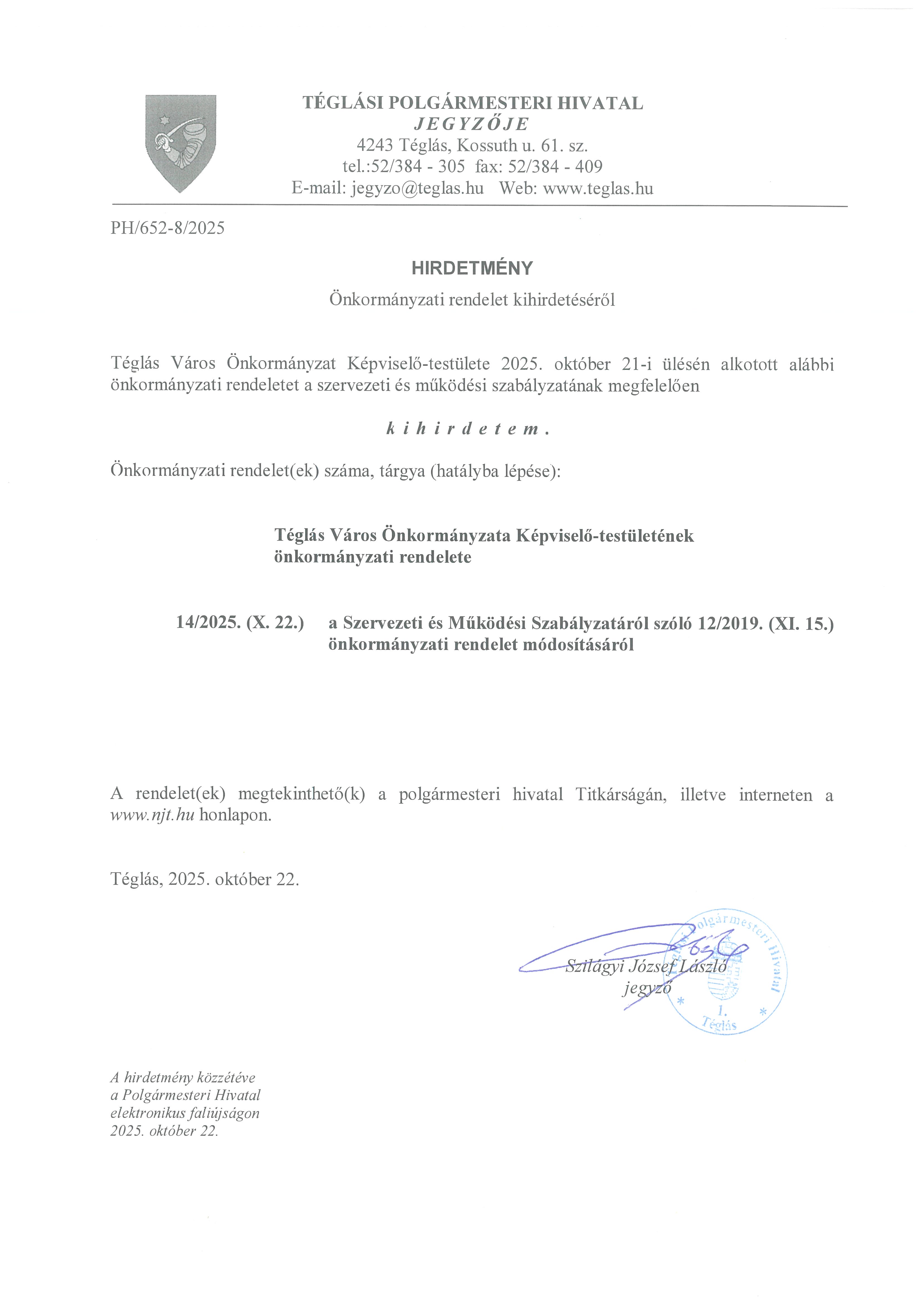 Téglás Város Önkormányzat Képviselő-testülete 2025. október 21-i ülésén alkotott önkormányzati rendeletek kihirdetése.