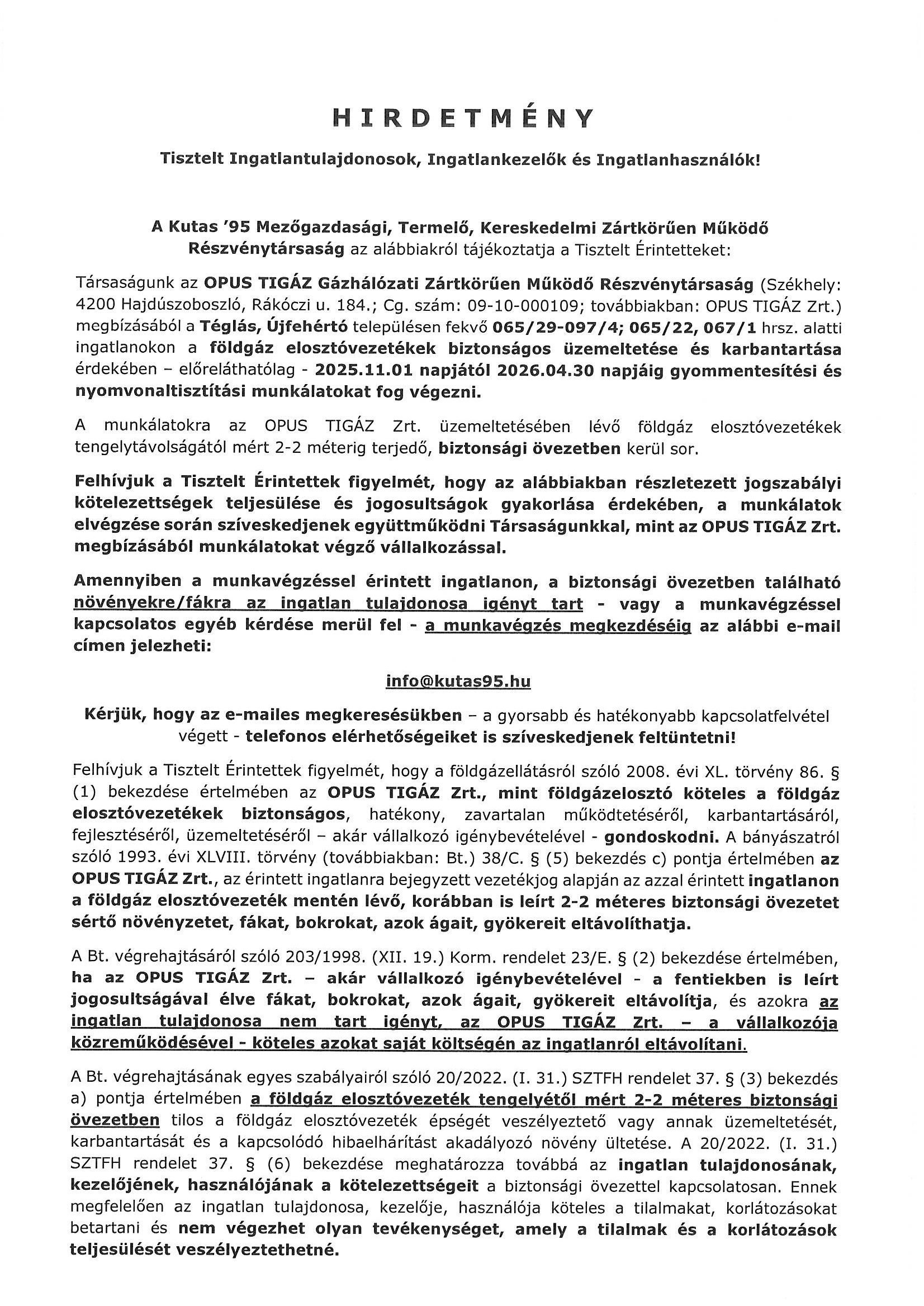 Az OPUS TIGÁZ Zrt. a földgáz elosztóvezetékek biztonságos üzemeltetése és karbantartása érdekében -előreláthatóan- 2025.11.01 napjától 2026.04.30 napjáig gyommentesítési és nyomvonaltisztítási munkálatokat fog végezni az alábbi helyszíneken.