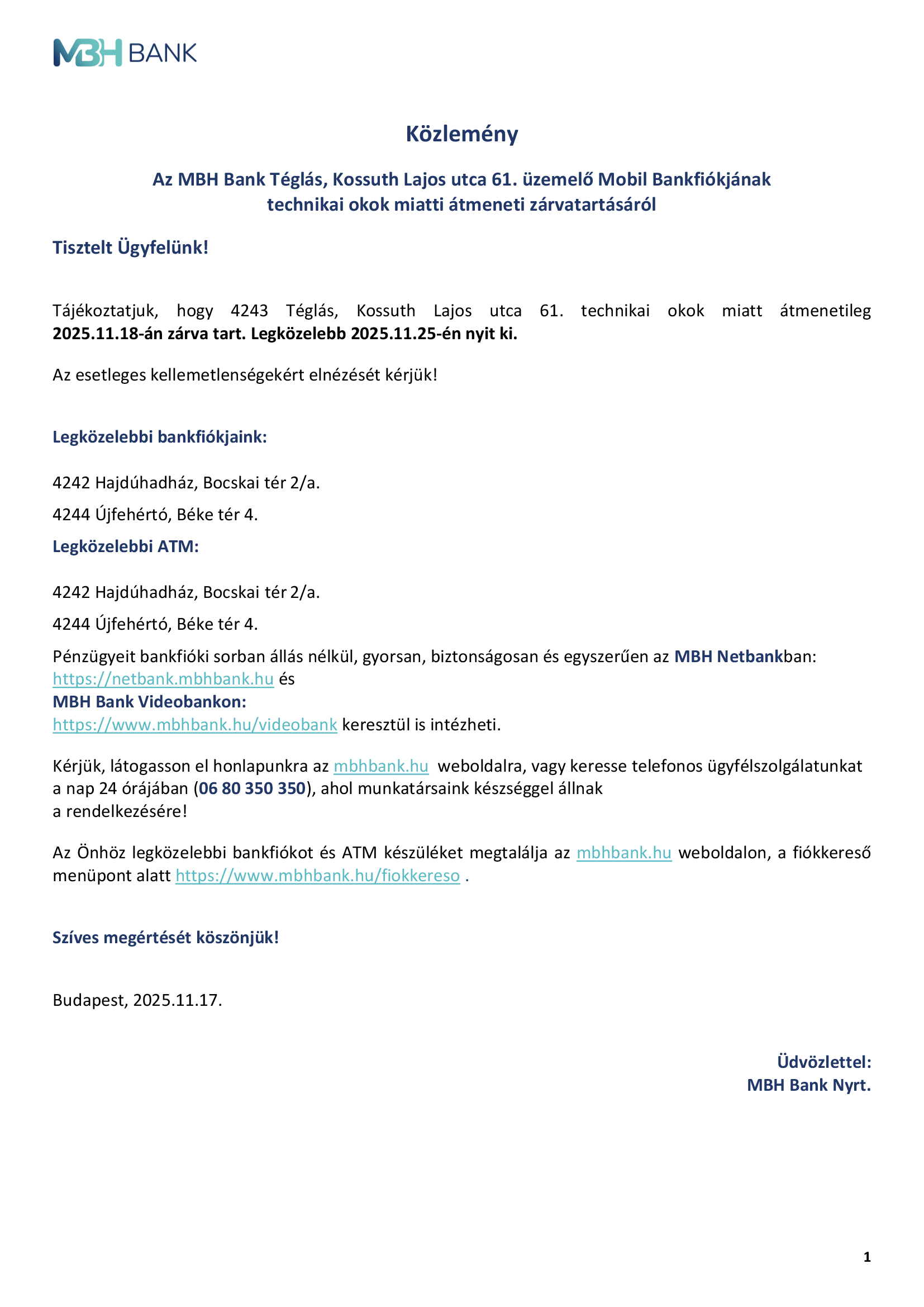 Közlemény az MBH Bank Téglás, Kossuth Lajos utca 61. üzemelő Mobil Bankfiókjának technikai okok miatti átmeneti zárvatartásáról.