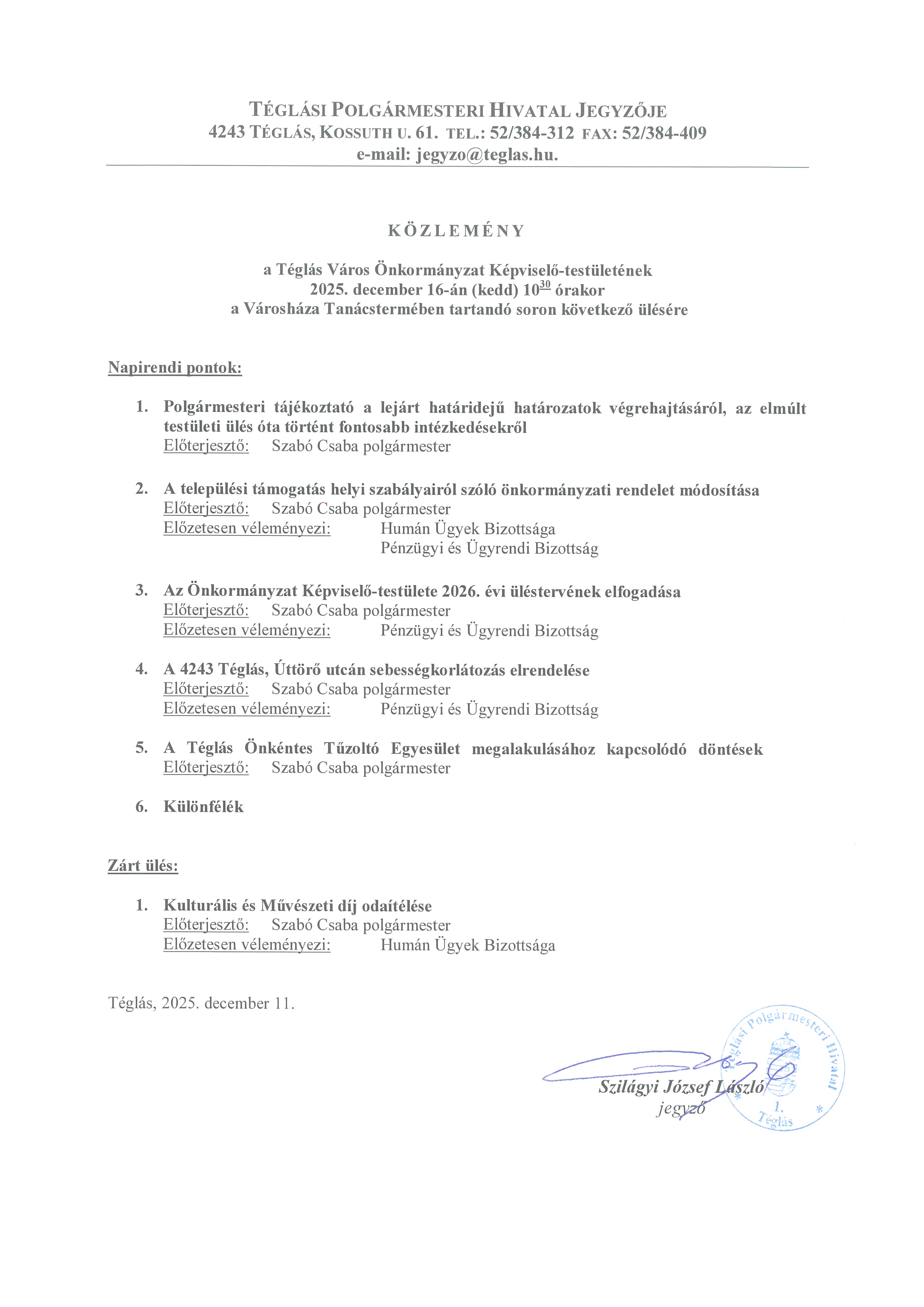 Téglás Város Önkormányzata Képviselő-testülete 2025. december 16-án 10.30 órakor tartja soron következő ülését.