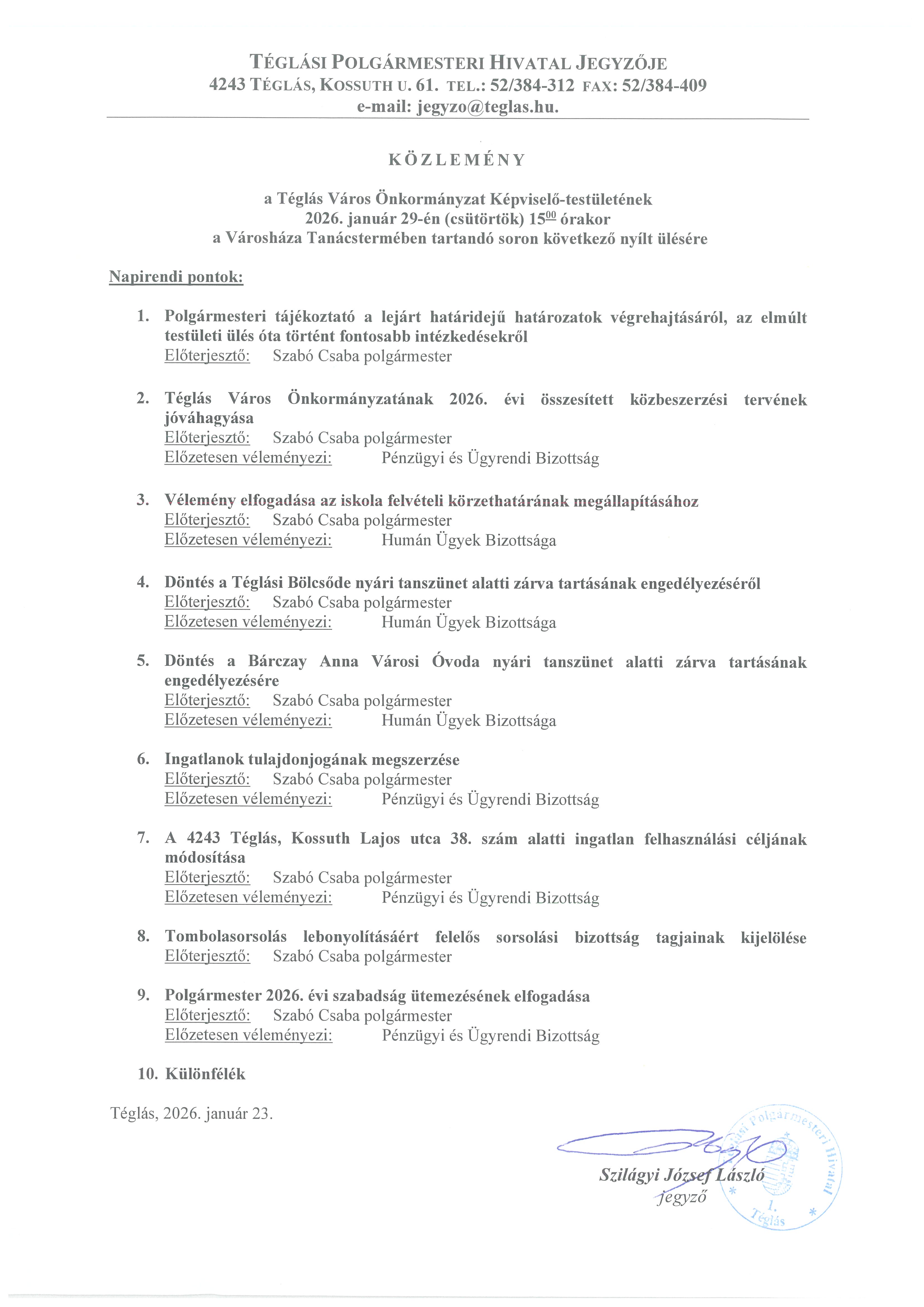 Téglás Város Önkormányzata Képviselő-testülete 2026. január 29-én 15.00 órakor tartja soron következő ülését.