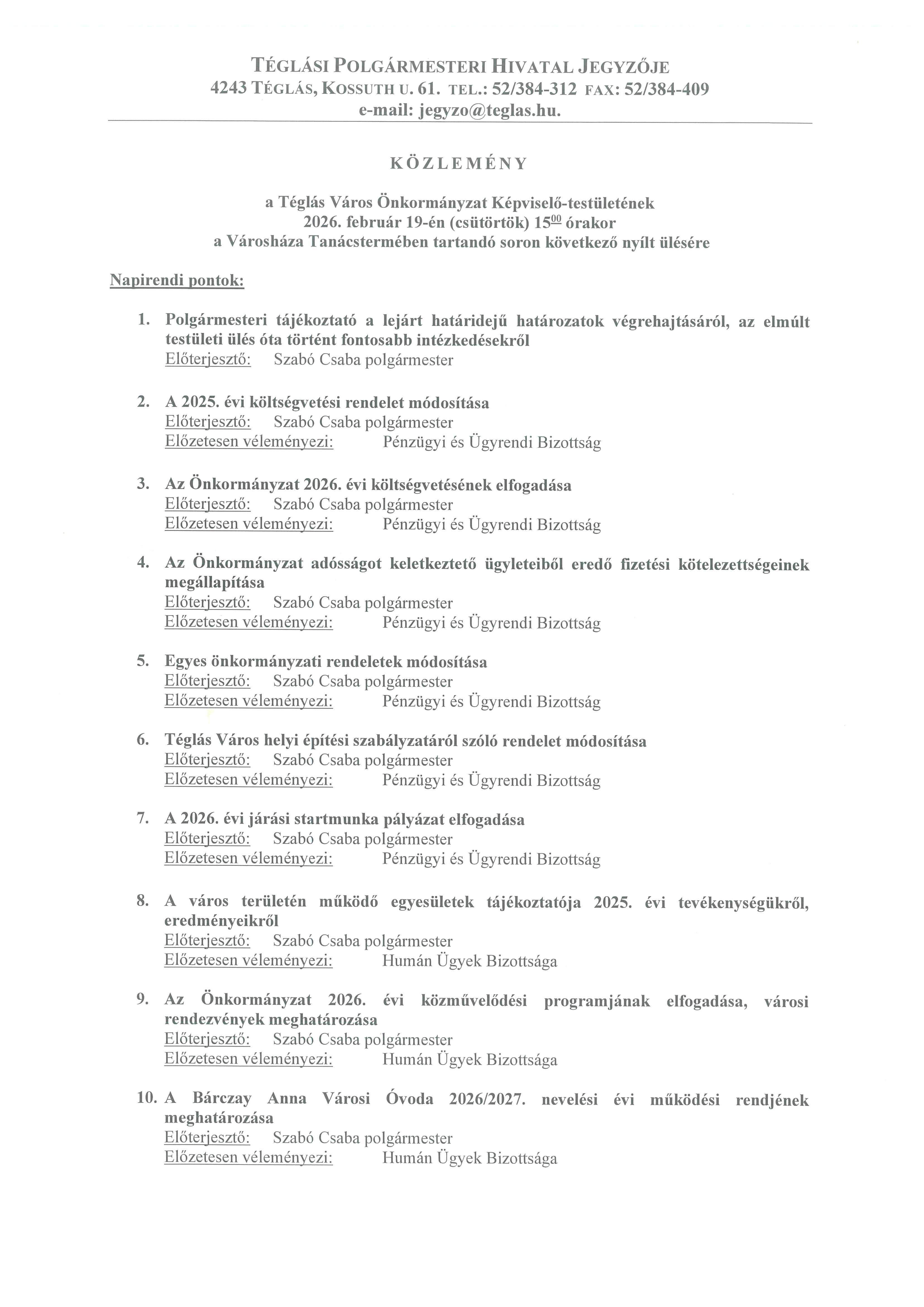 Téglás Város Önkormányzata Képviselő-testülete 2026. február 19-én 15.00 órakor tartja soron következő ülését.