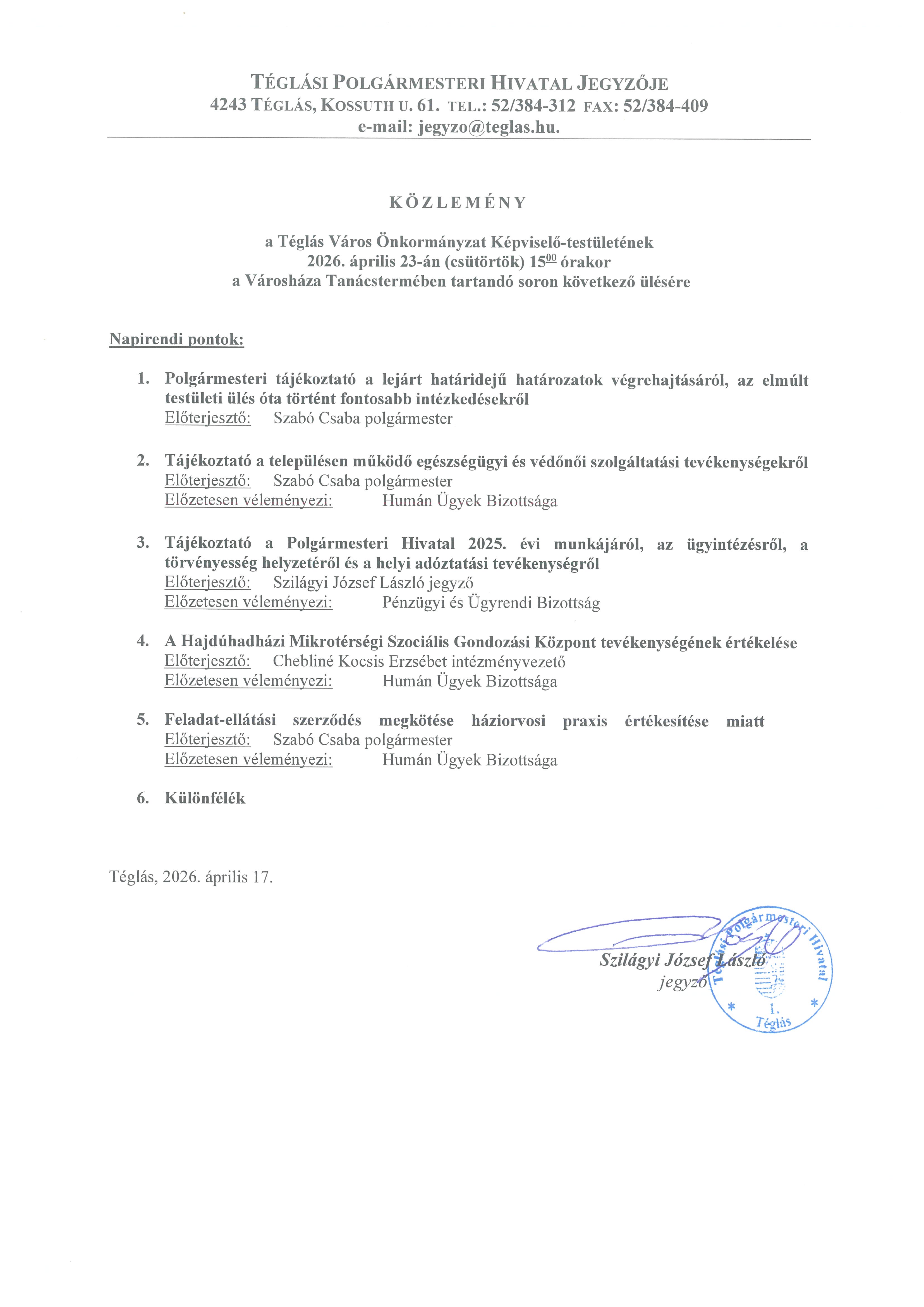 Téglás Város Önkormányzata Képviselő-testülete 2026. április 23-án 15.00 órakor tartja soron következő ülését.