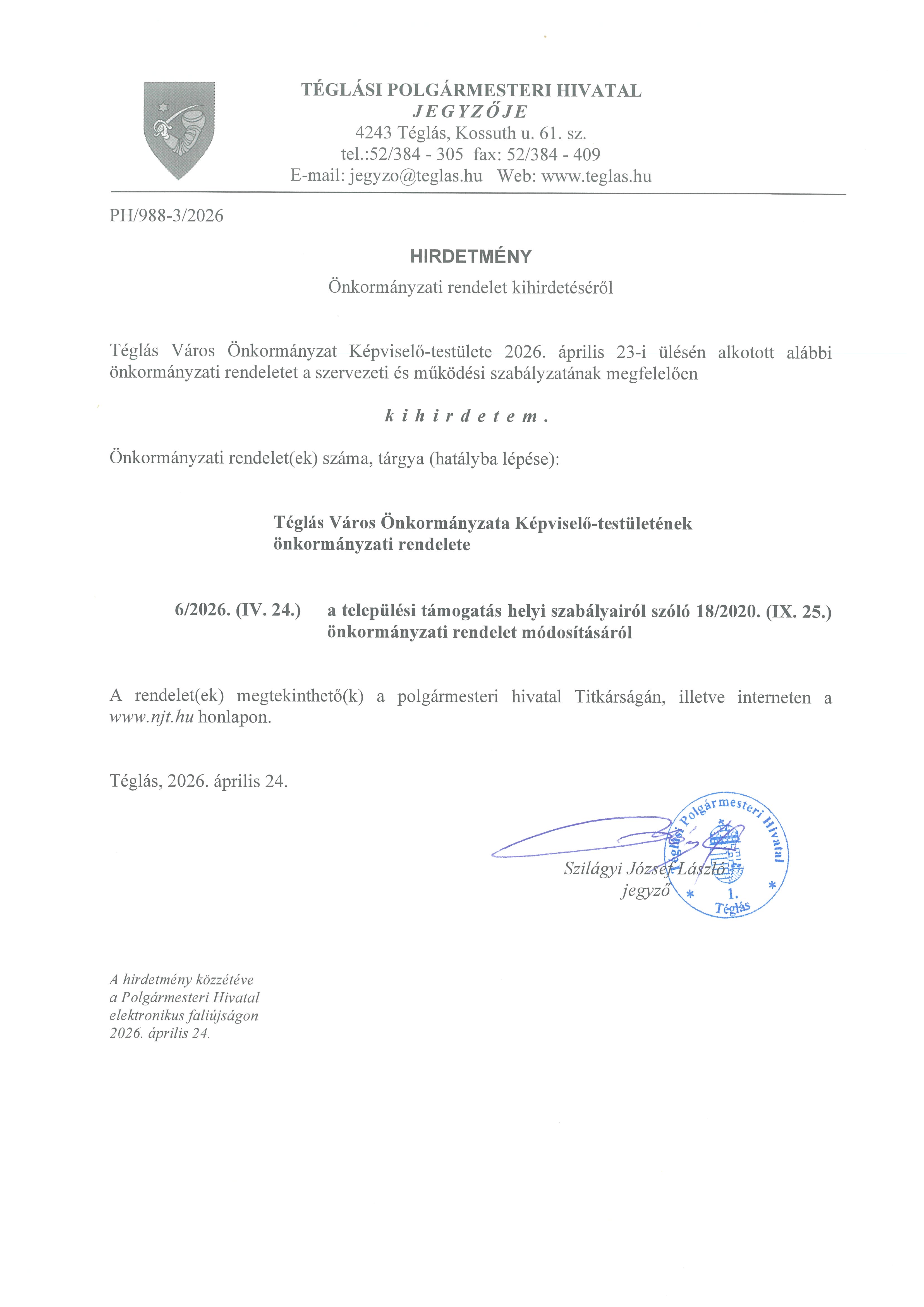 Téglás Város Önkormányzat Képviselő-testülete 2026. április 23-i ülésén alkotott önkormányzati rendeletek kihirdetése.
