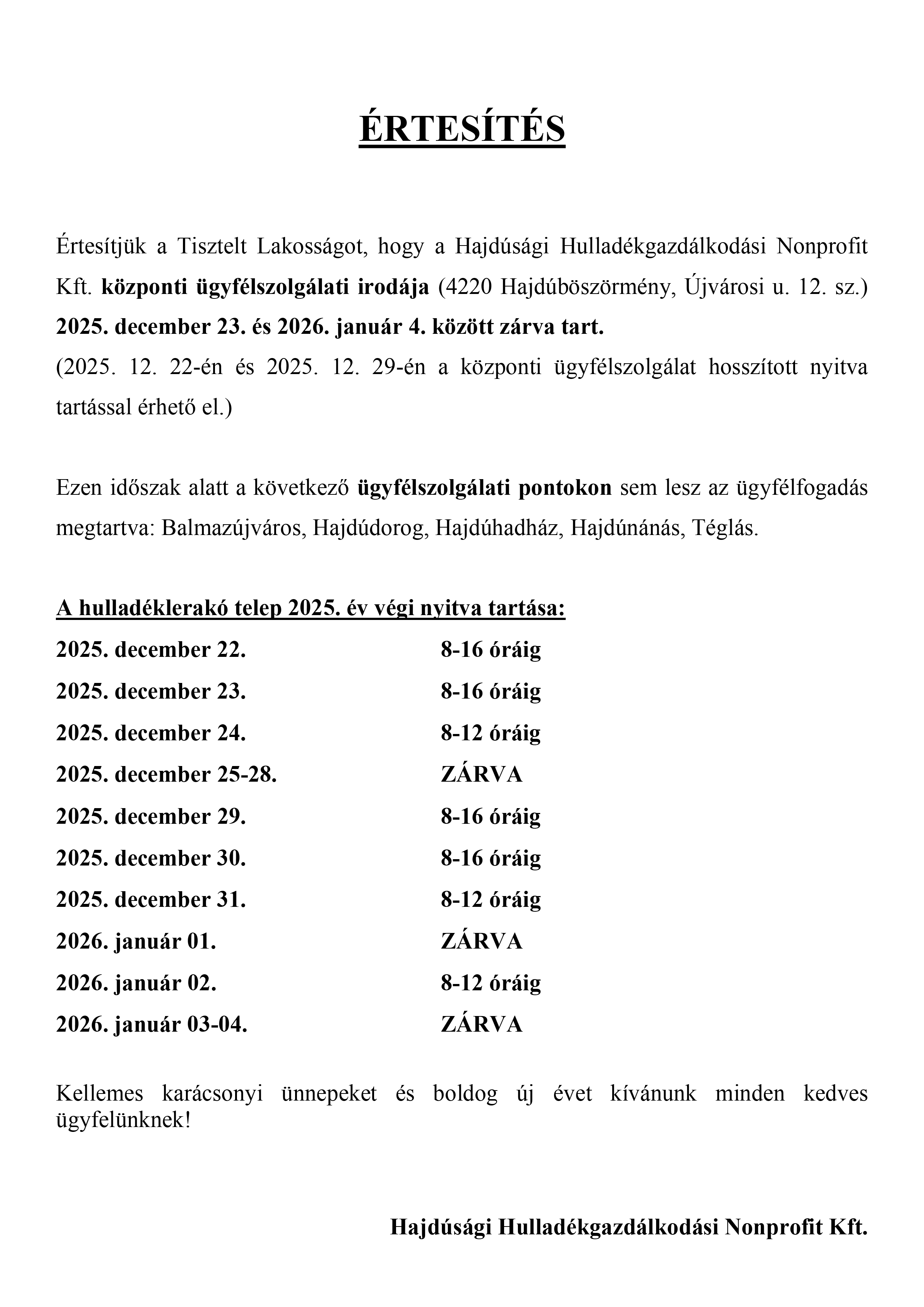 Hulladéklerakó címe: 4220 Hajdúböszörmény, Czégényi útfél 01329/4 hrsz., (Hajdúvid és Hajdúhadház közötti úton), telefonszám: +36-52/710-613