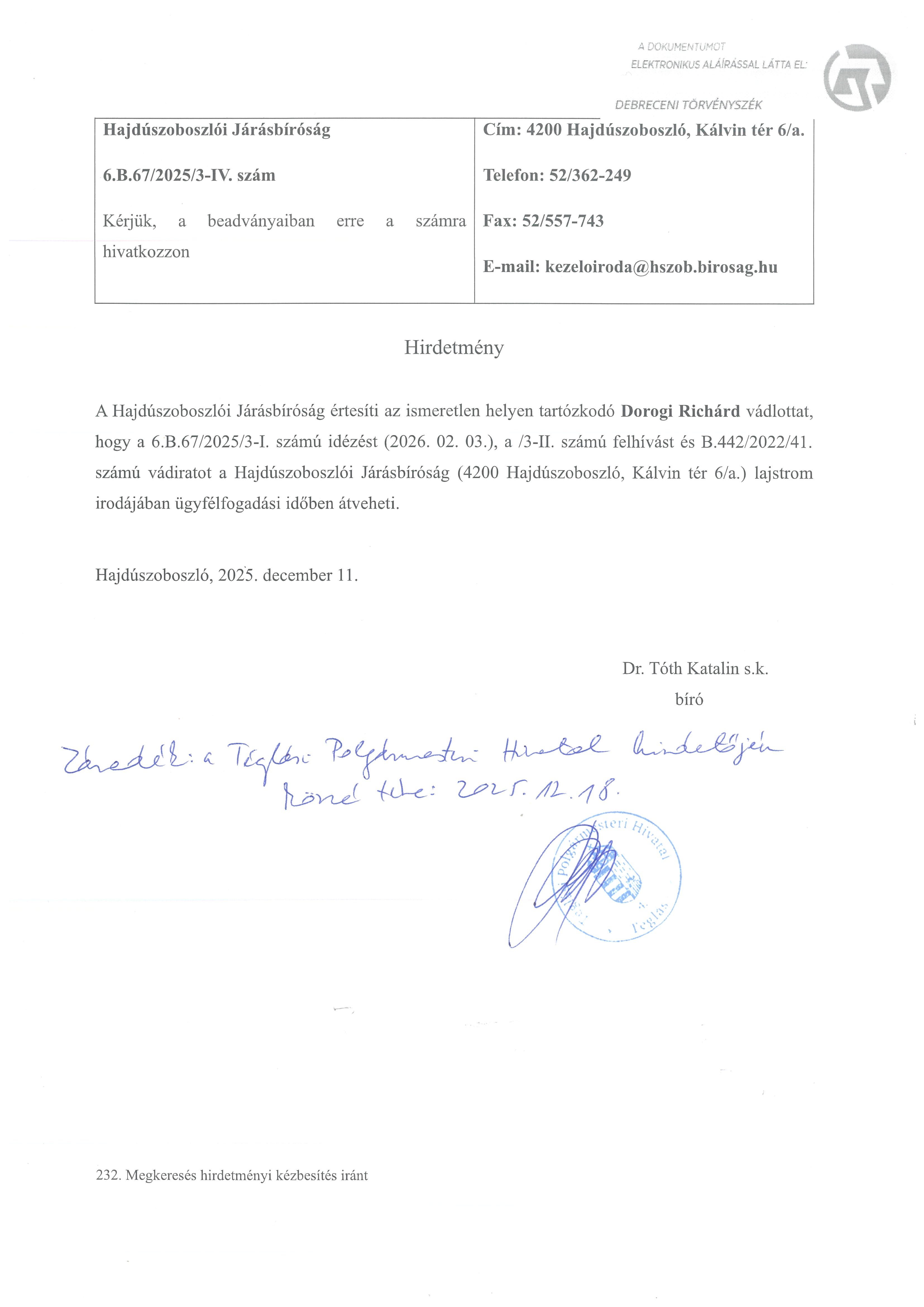 A Téglási Polgármesteri Hivatal 2025. december 22. és 2026. január 2. között zárva tart.