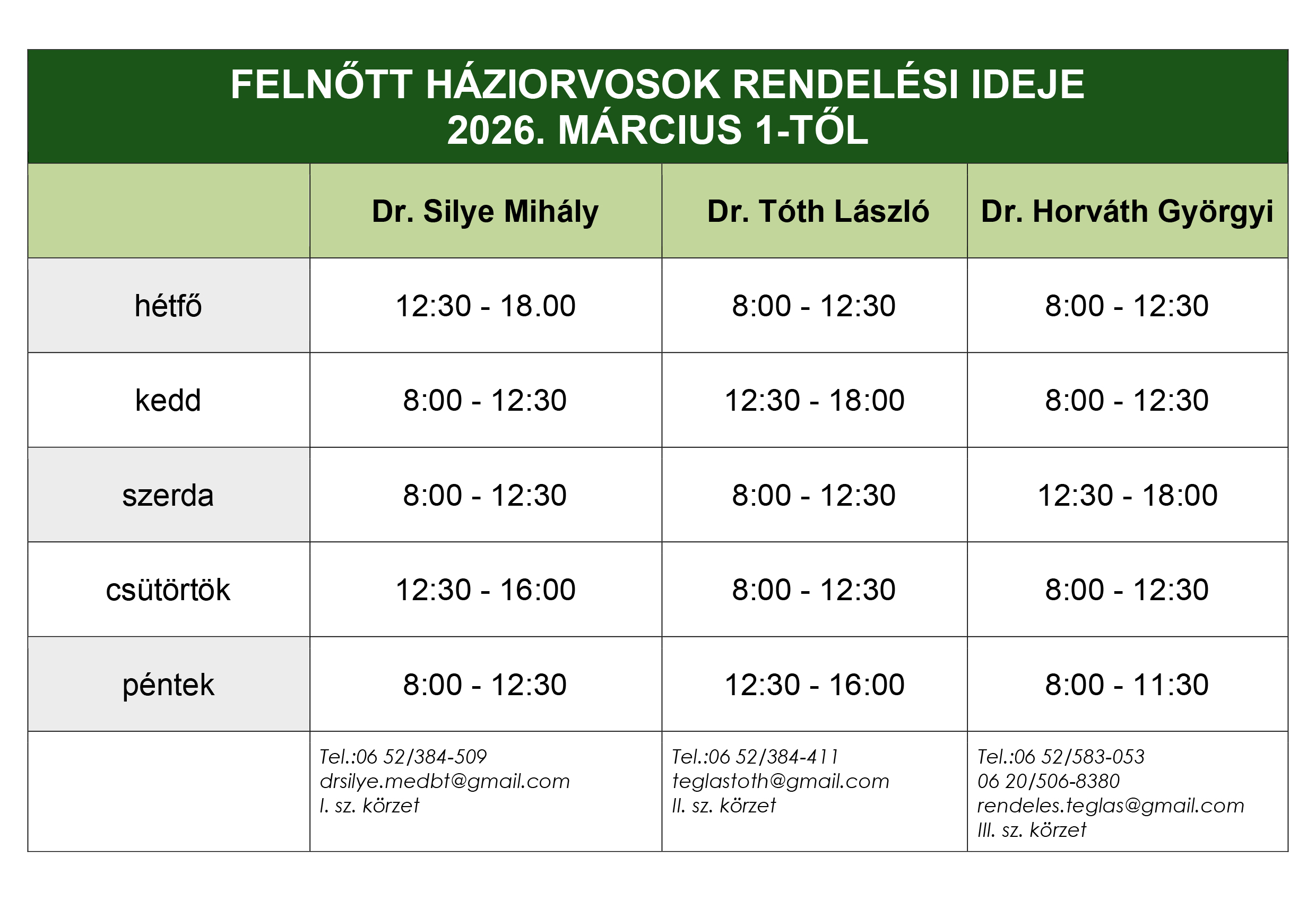 Felnőtt háziorvosok rendelési ideje 2026. március 1-től.