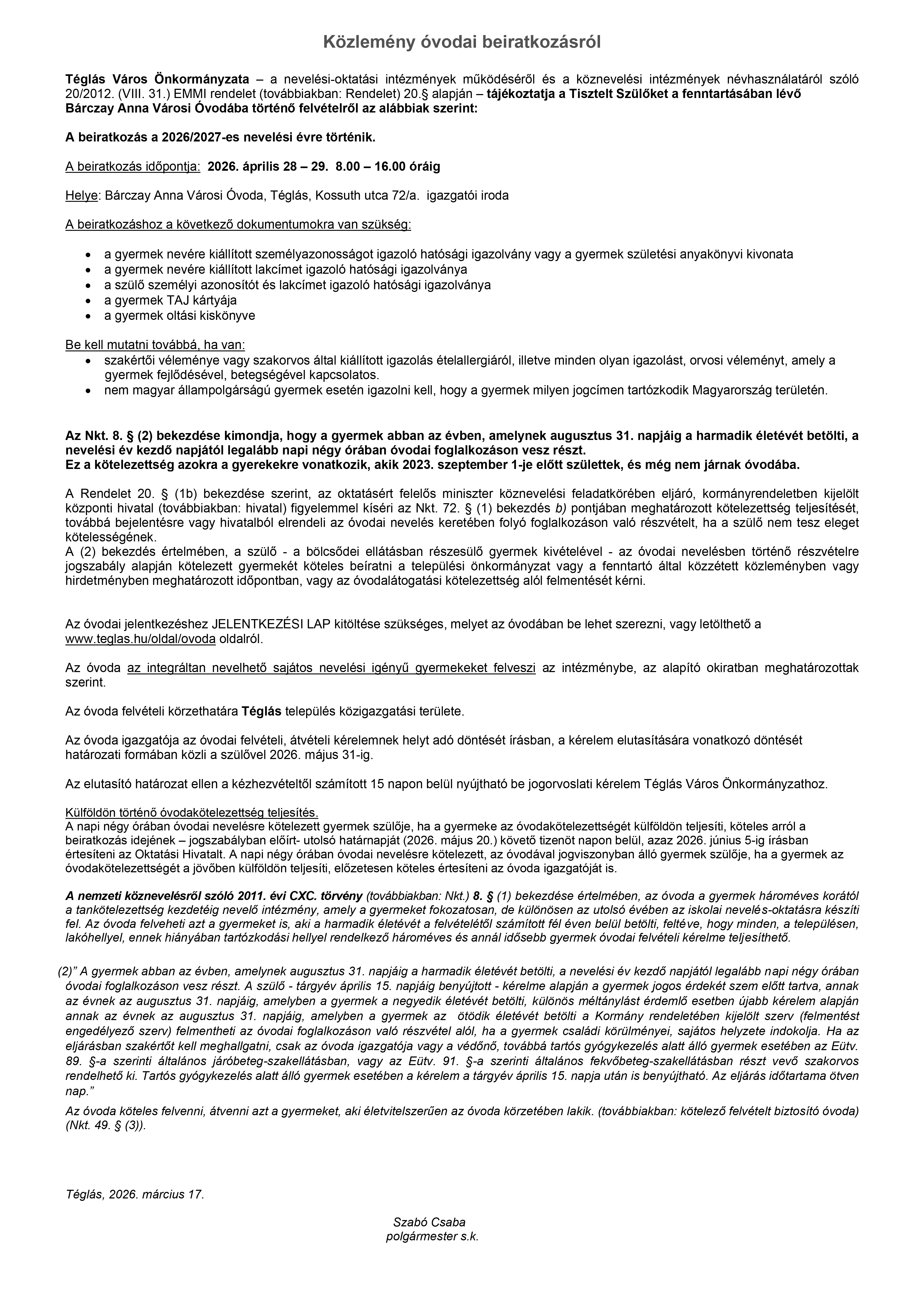 Óvodai beiratkozással kapcsolatos közlemények, nyilatkozatok a 2025/2026-os nevelési évre: